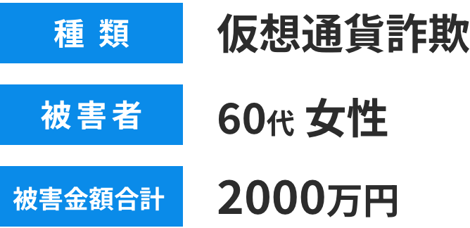 などと言われ、グループチャットで知り合った者が指定する口座への振り込みと暗号資産の送信により合計約2,000万円をだまし取られた。