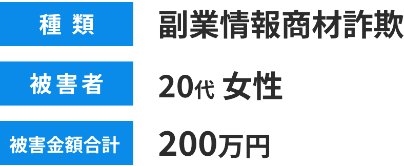 動画投稿サイトで広告を見て、副業サイトにアクセスし、無料通話アプリで友達登録した。「情報商材の購入が必要」というので、約2,000円の情報商材を購入すると、後日、事業者から電話があり「詳細を説明するので予約をするように」と案内された。約束した日に事業者から電話で